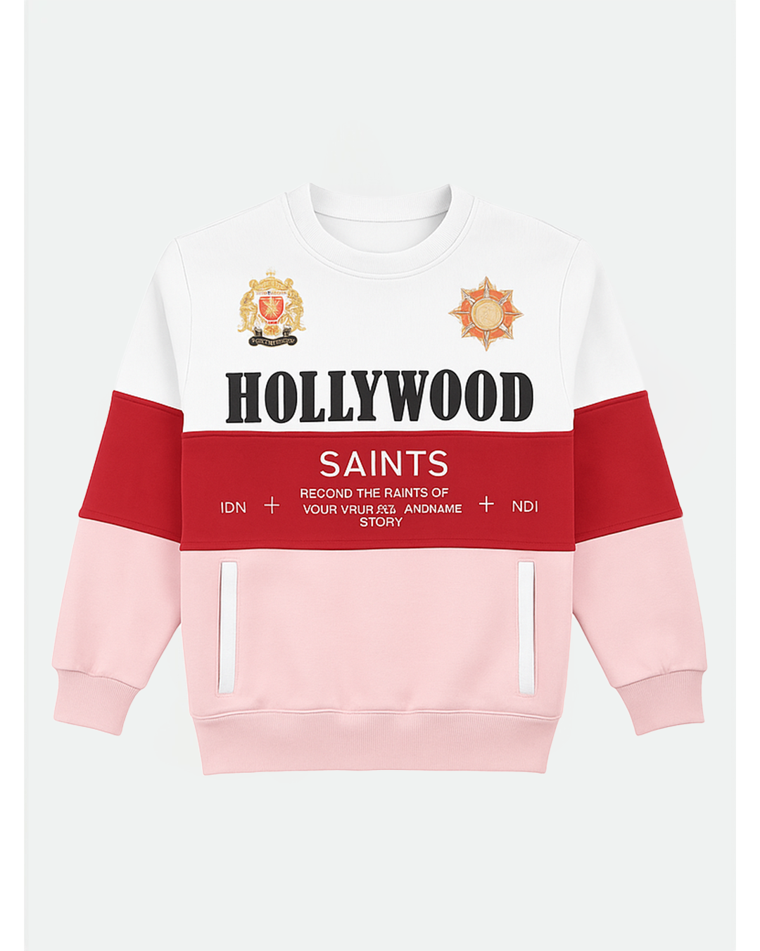 Elevate your streetwear rotation with the Hollywood Saints Crest Block Sweatshirt, a bold colorblock pullover that blends modern luxury with vintage athletic flair. Featuring a triple-tone palette of white, crimson red, and blush pink, this standout piece is detailed with printed royal crest motifs and the bold HOLLYWOOD SAINTS logo across the chest.
